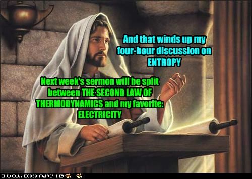 And that winds up my four-hour discussion on entropy. Next week's sermon will be split between the second lay of thermodynamics and my favorite: electricity.