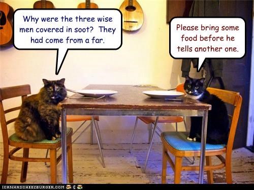 Why were the three wise men covered in soot? They had come from a far. Please bring some food before he tells another one.