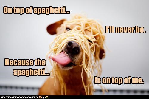 On top of spaghetti... I'll never be. Because the spaghetti... Is on top of me.