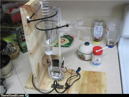 A while back I decided to see how my coffee maker worked. I busted it open and by the time I figured things out, I couldn't put it back together (broken). So I decided I didn't want to buy a new coffee maker and I built this stand for the machine innards. The reservoir was built into the old machine, so I had to add the bottle to hold the water as it heats up. It works great!