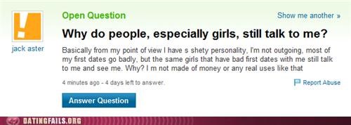 Seriously, after all the whiners I see on the internet every day who complain "Wahhh, I look amazing and have a great personality, why don't girls talk to me, wahhhh," it's a breath of fresh air to see someone go "hey, deep down I'm a miserable excuse for a human being, yet for some reason I have to beat girls off with a stick!"