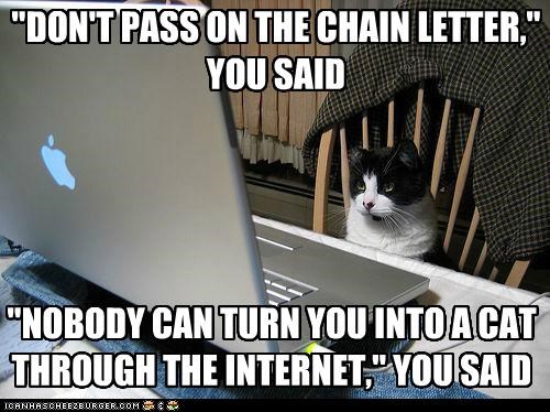 "DON'T PASS ON THE CHAIN LETTER," YOU SAID "NOBODY CAN TURN YOU INTO A CAT THROUGH THE INTERNET," YOU SAID