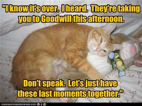 "I know it's over. I heard. They're taking you to Goodwill this afternoon. Don't speak. Let's just have these last moments together."