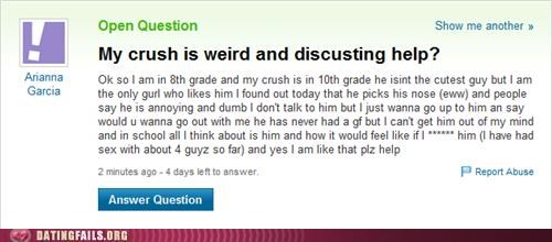 Ah, young lovers. They still haven't learned that you're allowed to stop liking someone when he turns out to be "discusting."