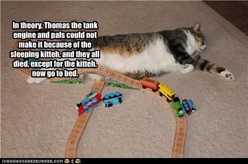 In theory, Thomas the tank engine and pals could not make it because of the sleeping kitteh, and they all died, except for the kitteh. now go to bed.