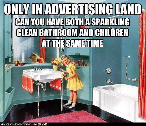 ONLY IN ADVERTISING LAND CAN YoU HAVE BOTH A SPARKLING CLEAN BATHROOM AND CHILDREN AT THE SAME TIME