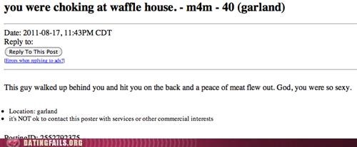 Craigslist fail of someone who someone with meat flying out of them when they were choking on in a Waffle house.