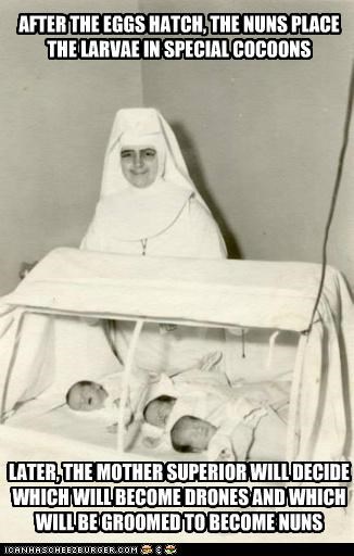 After the eggs hatch, the nuns place the larvae in special cocoons. Later, the Mother Superior will decide which will become drones and which will be groomed to become nuns.