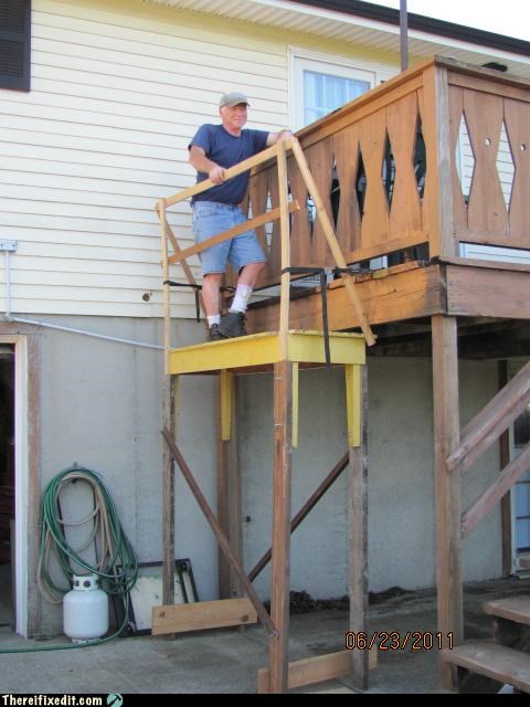 My husband bolted this Sunday School table to boards and held it on with rachet straps around the deck so he could paint our deck. Only problem -- How to get on to the scaffolding -- solution -- put a chair on the deck, stand on it, swing leg over deck rail, drop down to the scaffold. Guess it worked.