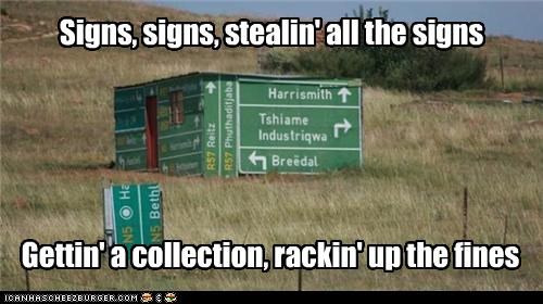 Signs, signs, stealin' all the signs Gettin' a collection, rackin' up the fines