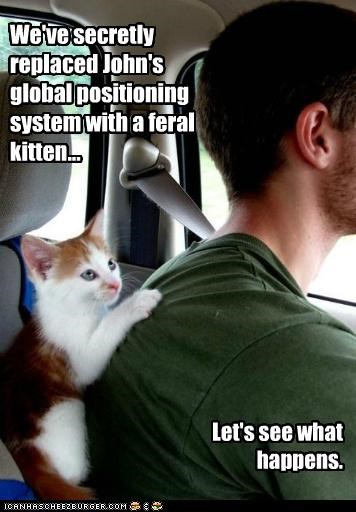 We've secretly replaced John's global positioning system with a feral kitten... Let's see what happens.