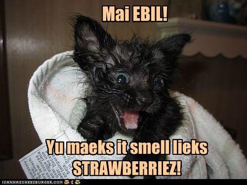 Mai EBIL! Yu maeks it smell lieks STRAWBERRIEZ!
