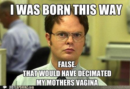 I WAS BORN THIS WAY FALSE. THAT WOULD HAVE DECIMATED MY MOTHERS VAGINA (Rainn Wilson)