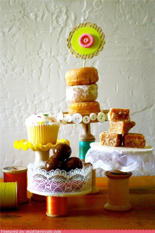 Next time you are hosting a quilting bee (and I know it's soon! Don't lie!) you can present snacks on little appropriate stands made out of thread spools. Themed presentation of snacks is one of the little things that make get-togethers extra special.