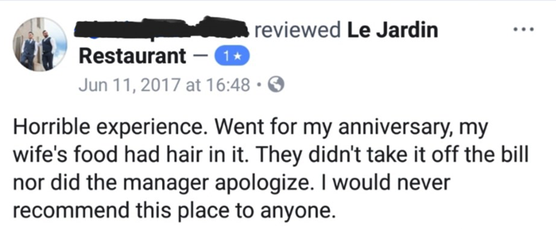 This loudmouthed patron with a bone to pick over 100% nothing, learned a brutally swift lesson in NOT lying to the internet. The restaurant really didn't need to try that hard to utterly bury the poor and foolish bastard, because it was as easy as stealing a lollipop from a baby. Lesson: don't lie to the internet because justice will find you.