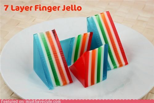 Finger jello is super fun even when it's only one color and just hanging out by itself. Taking the extra time to layer a whole bunch of colors in there takes it to a whole new level of snack innovation. I wonder how it tastes with all those flavors in one mouthful? Like a rainbow of fruit?