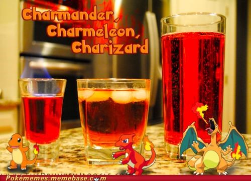 Charmander- 1 splash of grenadine 1 oz Fireball Cinnamon Whiskey .5 oz Bacardi 151 Pour a slash of grenadine into the bottom of a shot glass. Add the Fireball, then top with the Bacardi 151. Light it on fire, then extinguish before drinking.