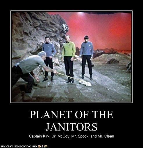 PLANET OF THE JANITORS Captain Kirk, Dr. McCoy, Mr. Spock, and Mr. Clean. -DeForest Kelley, William Shatner, Leonard Nimoy