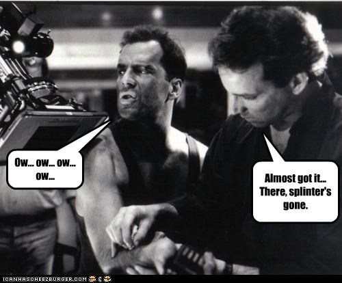 Ow...ow...ow...ow...Almost got it... There, splinter's gone. -Bruce Willis