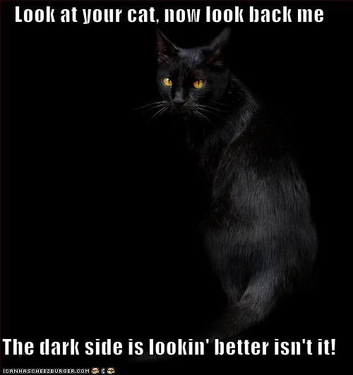 Look at your cat, now look back me The dark side is lookin' better isn't it!