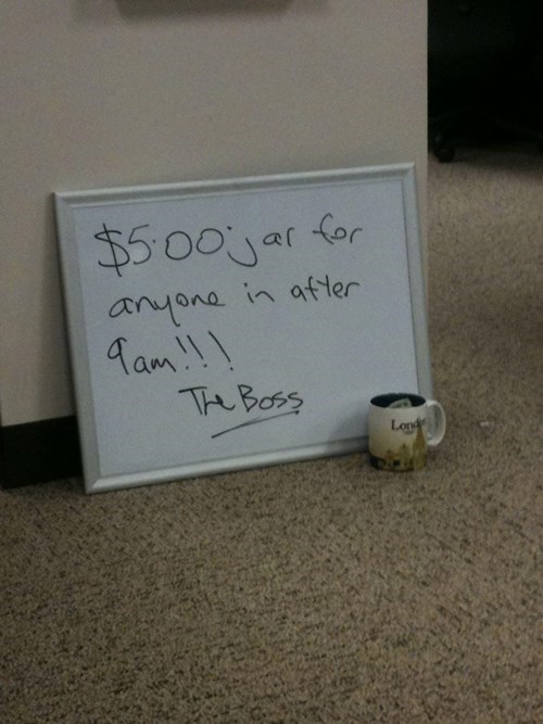 ...it's actually a tacky policy, but when you're able to quantify the cost of coming to work late, it usually makes the thought of being late more appealing. Especially early in the morning.