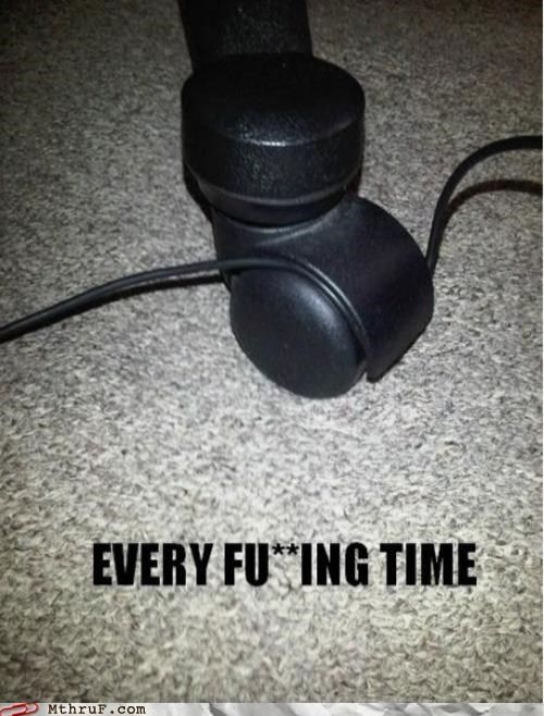 So at work I occasionally listen to music through headphones (don't worry, they do a good job of keeping the sound in and I make sure the music doesn't leak out and annoy coworkers etc. etc.). When I wear my headphones, the headphone wire hangs on the right side of my office chair's arm. When I put my headphones back on my desk, the wire loops around the left side of my chair's arm. When I roll my chair away to get up, the wire catches and my headphones clatter to the floor. EVERY. GODDAMN. TIME.