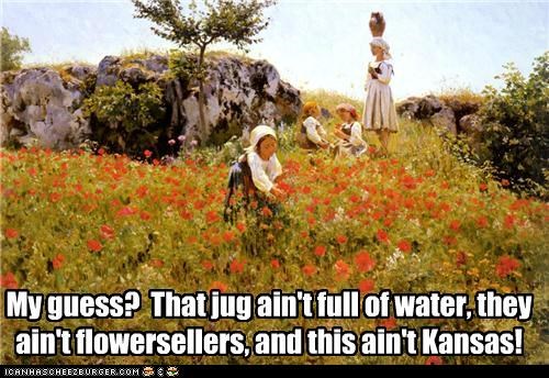 My guess? That jug ain't full of water, they ain't flowersellers, and this ain't Kansas!