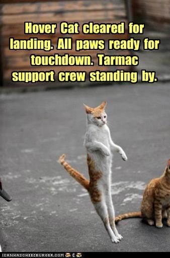 Hover Cat cleared for landing. All paws ready for touchdown. Tarmac support crew standing by.