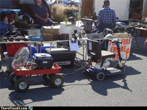 Driving around a flea market in a rascal wasn't giving you enough odd looks, eh? Good thing it broke down so you had an excuse to tow around a generator and ensure never-ending mockery. ~NSHA