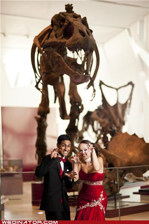 My husband and I (I'm the bride in red!) got married a the Royal Ontario Museum in Toronto this past August. We were both huge "Jurassic Park" fans as kids, so taking the opportunity to get some fun photos with the T-rex skeleton was a must for our wedding album!"