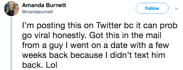 Agreed: HOW does it get any worse than that? Part of me is thinking this is an act of trolling by a snarky guy that isn't giving up (after getting ghosted) just yet...