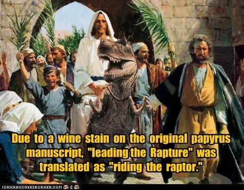 Due to a wine stain on the original papyrus manuscript, "leading the Rapture" was translated as "riding the raptor."