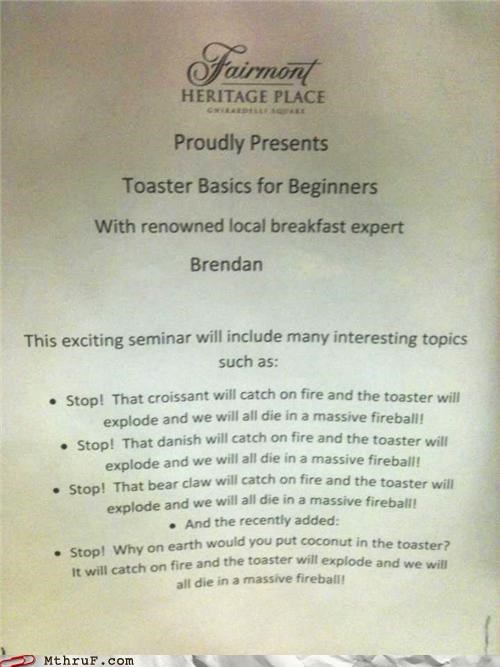 I set up continental breakfast in a hotel where guests constantly set croissants on fire in the toaster... My boss put this up in our kitchen after I suggested we have a class on how to use a toaster (I'm Brendan).