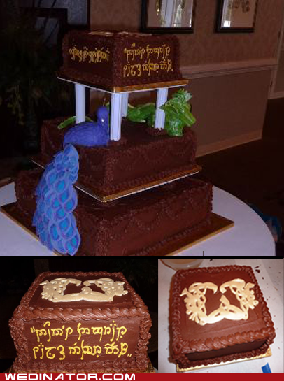 Remember the "Samus Settles Down" entry? Well, that was us, and now we're married as of November 5th (and yes we milked the V for Vendetta references)! It was more Lord of the Rings themed though: he got the groomsmen little sword replicas from the movies, and got me an Arwen necklace. This pic is of the groomsman's cake his mom made (she is incredible), complete with a dragon and a peacock (big symbols for us), and writing in Elvish around the top, saying our names, the wedding date, the locati