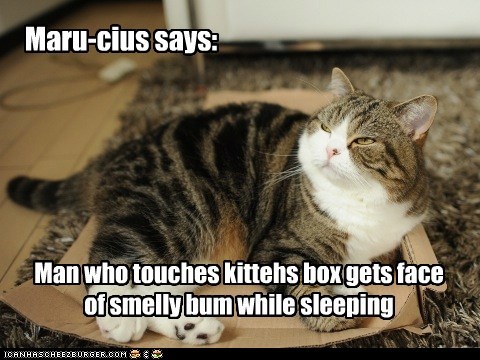 Maru-cius says: Man who touches kittehs box gets face of smelly bum while sleeping