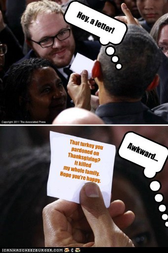 Hey a letter! That turkey you pardoned on Thanksgiving? It killed my whole family. Hope you're happy. Awkward... (