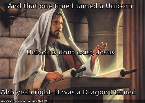 And that one time I tamed a Unicorn Unicorns dont exist, Jesus Ahh yeah right, it was a Dragon I tamed