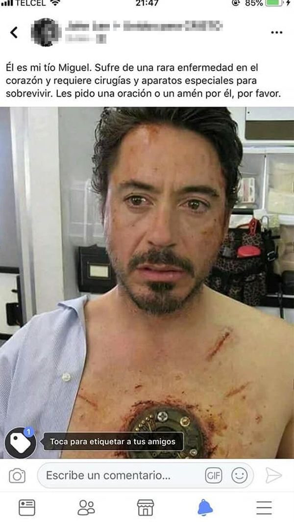 Solo era una cuestión de tiempo para que a un troll se le ocurriera la idea de usar una foto de Robert Downey Jr. en su icónico papel de Tony Stark para recaudar los amén que a las tías les encanta tanto dar.