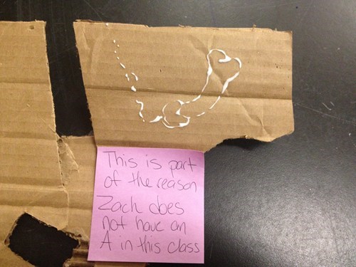This was created by a high school student in my sculpture class. He's always screwing around, pissing off and offending other students, and begging me to give him an A in the class. I told him I was going to email this photo to his mom.