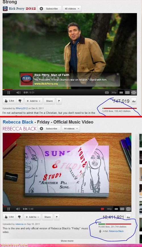 Rebecca Black's "Friday" has been considered the worst YouTube video of all time since its debut, but Texas presidential hopeful Rick Perry is giving Black a run for her money.