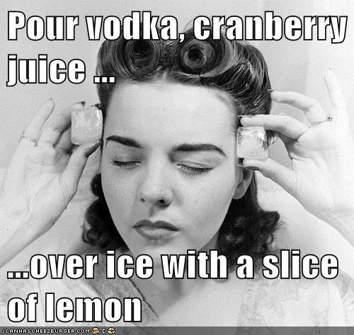 Pour vodka, cranberry juice ... ...over ice with a slice of lemon