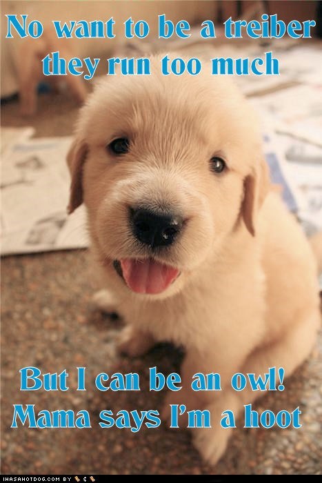 No want to be a 'treiber, they run too much. But, I can be an owl! Mam says I'm a hoot!