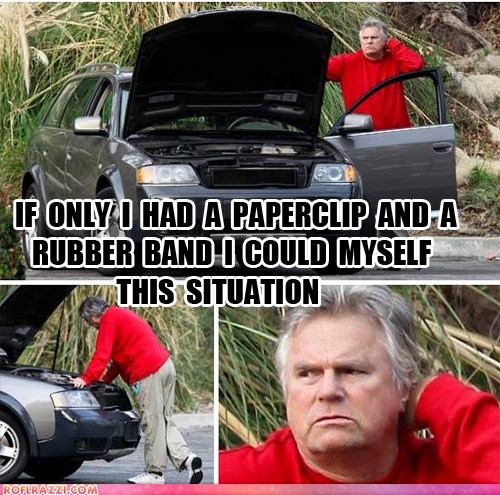 Apparently his TV training as a savvy secret agent for the Phoenix Foundation didn't equip him with the skills to repair his station wagon with common, everyday items.