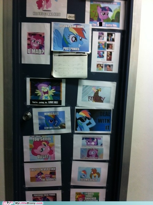 So, I found out a friend of mine, who's currently on holiday back home, doesn't like MLP: FiM! Clearly, the solution here would be to plaster his door in MLP images while he's away!