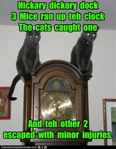 Hickary dickory dock 3 Mice ran up teh clock The cats caught one And teh other 2 escaped with minor injuries.