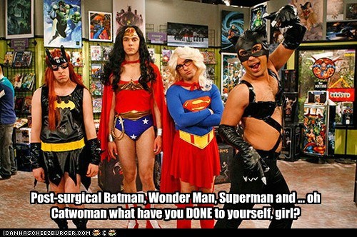 Post-surgical Batman, Wonder Man, Superman and... oh Catwoman what have you DONE to yourself, girl? -The Big Bang Theory