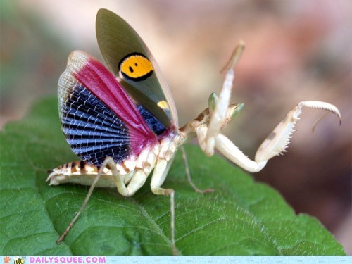 Here we have the blue-winged mantis, which overall looks pretty creepy except for its fabulously tie-dyed wings! What do you squeeps think, is this bug creepy or cute? -Sally Squeeps