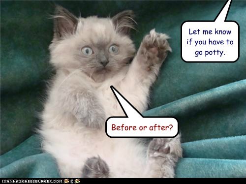 Let me know if you have to go potty. Before or after?