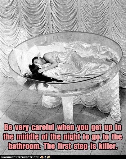 Be very careful when you get up in the middle of the night to go to the bathroom. The first step is killer.