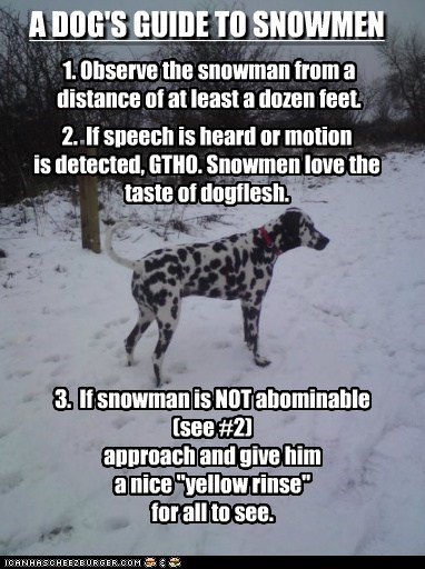A DOG'S GUIDE TO SNOWMEN 1. Observe the snowman from a distance of at least a dozen feet. 2. If speech is heard or motion is detected, GTHO. Snowmen love the taste of dogflesh. 3. If snowman is NOT abominable (see #2) approach and give him a nice "yellow rinse" for all to see.